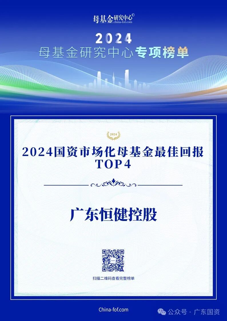 恒健控股公司获评“2024国资市场化母基金最佳回报TOP4”;旗下广东省农业供给侧结构性改革基金获评“2024省级政府引导基金最佳退出TOP14”;旗下广东恒健资产获评“2024最佳先进制造领域投资机构TOP30”。